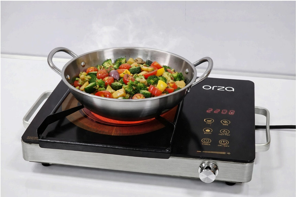 Orza has a maximum power of 2200W, but it doesn’t run at full power continuously. You can control the heat with the knob, so it uses only the required power — similar to how you adjust flame on gas.